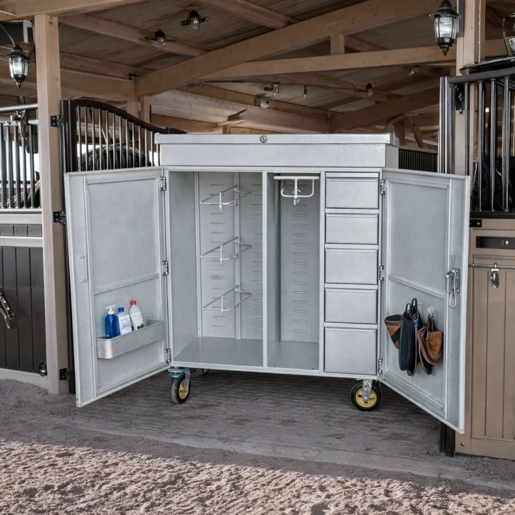 Biztonságos és rendszerezett tárolás a nyergeknek, kantároknak és kiegészítőknek – hogy a felszerelés akár otthon akár versenyen mindig gördülékeny legyen.